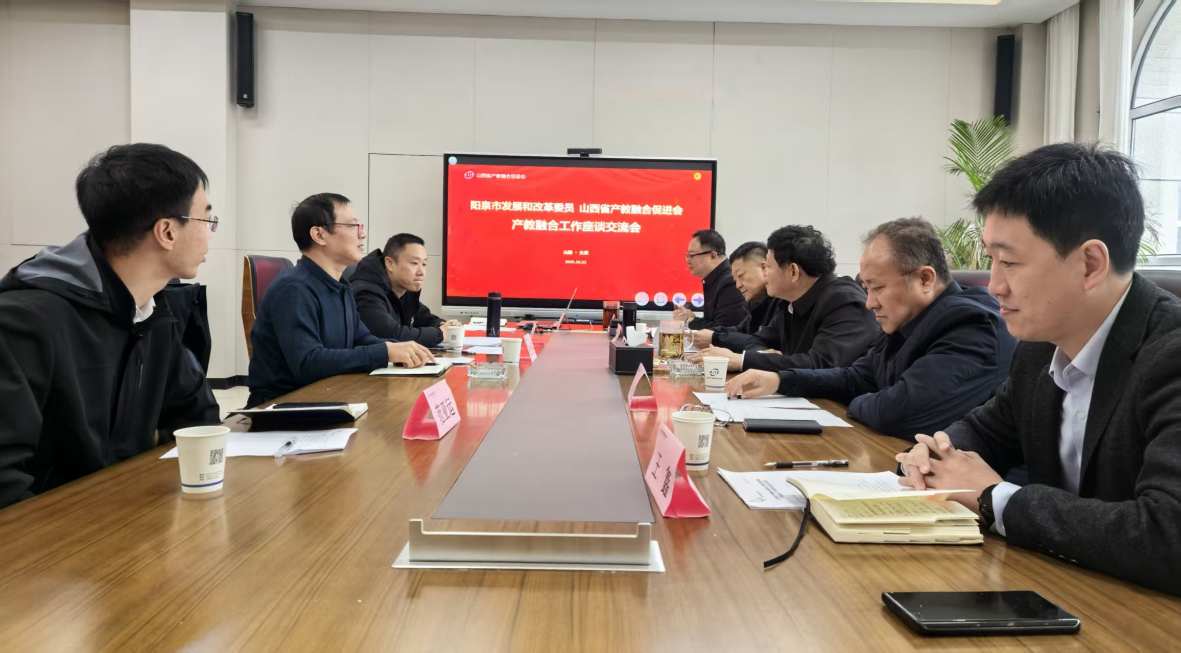 当前位置:首页 > 产学研动态10月23日,山西省产教融合促进会与阳泉市发展和改革委员会举行产教融合工作座谈会。阳泉市发改委党组成员、副主任张宏程,社会科科长刘斌;促进会理事长赵新利,副理事长侯企强、陈清胜,副理事长兼秘书长邢李鹏,促进会专家委员会办公室主任王鑫、副秘书长王鑫鑫、范亚运(兼会员工作部部长)等参加会议。